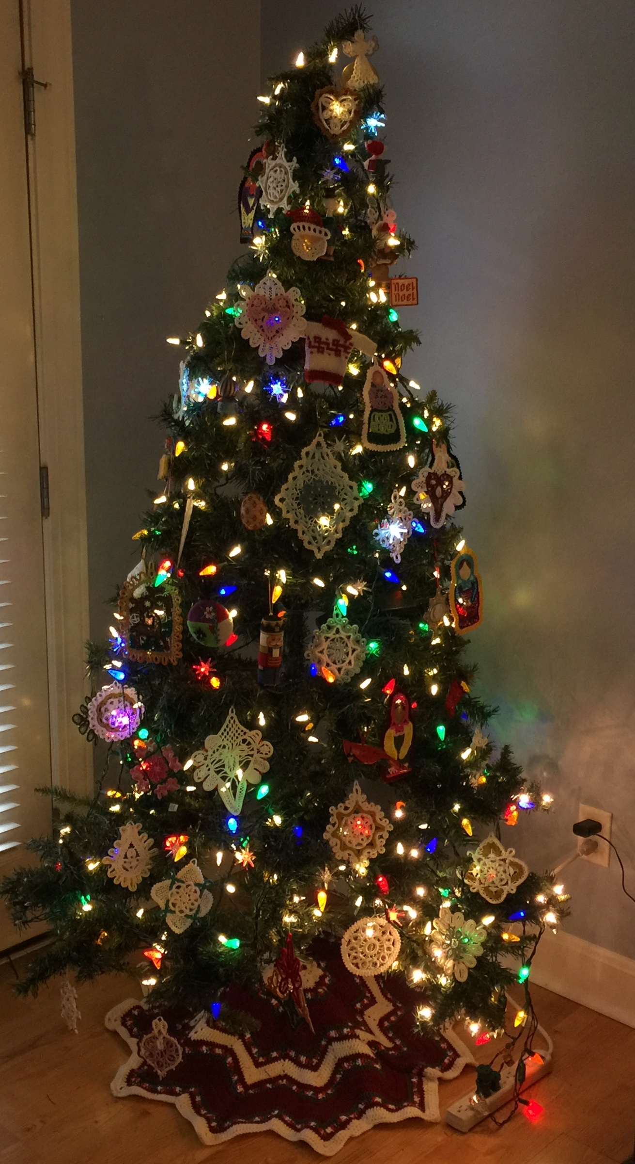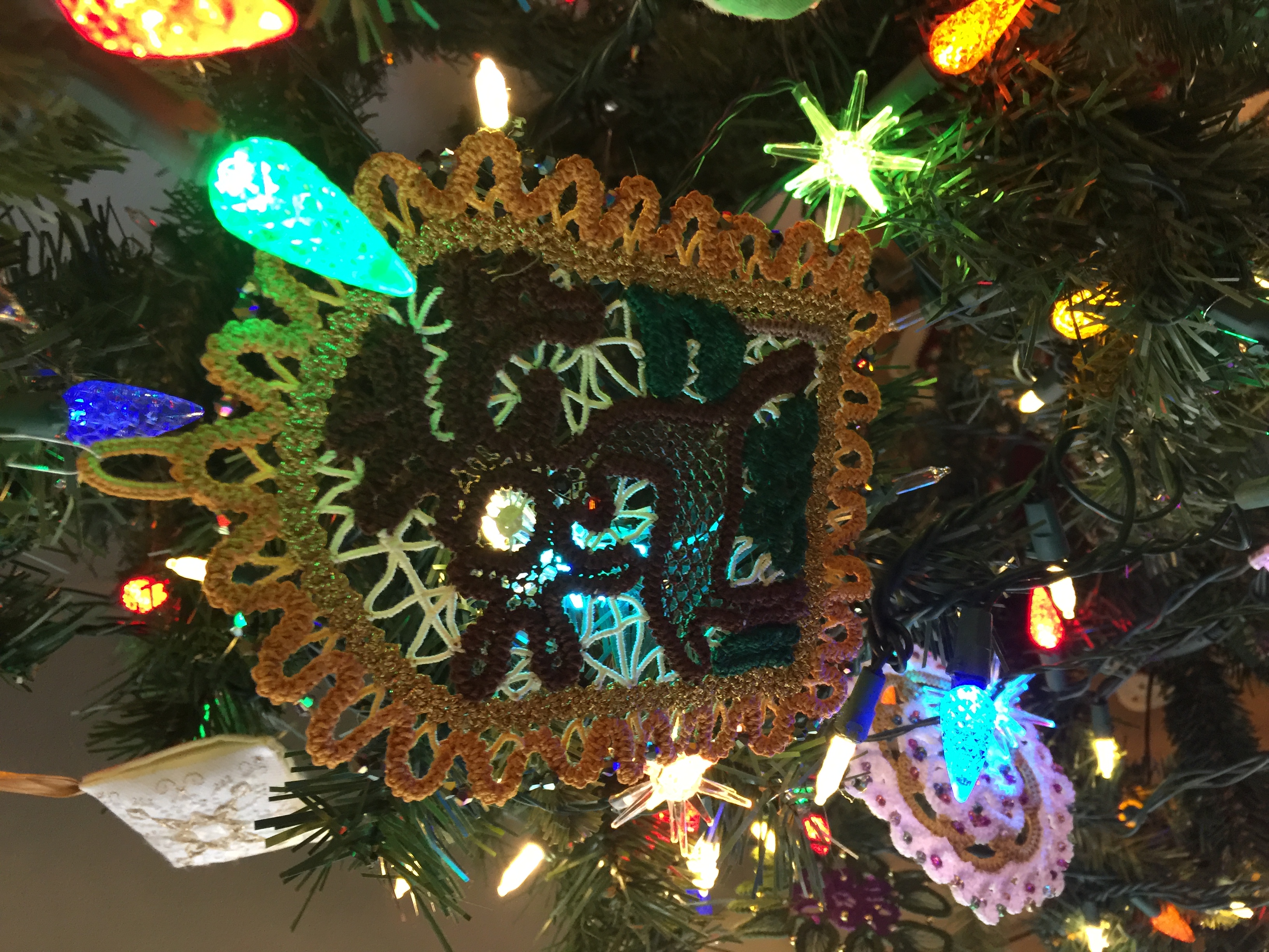 Ta-DAH! I finished it! 6 years, 11 months agoBecause family are coming for Thanksgiving and not for Christmas, I put my tree up today. I have tried to answer the question, “How many Romanian Point Lace ornaments are too many for one tree?” The reindeer is the first of a new set of larger, bordered ornaments I’m trying to design. First one finished. TA DAA!!