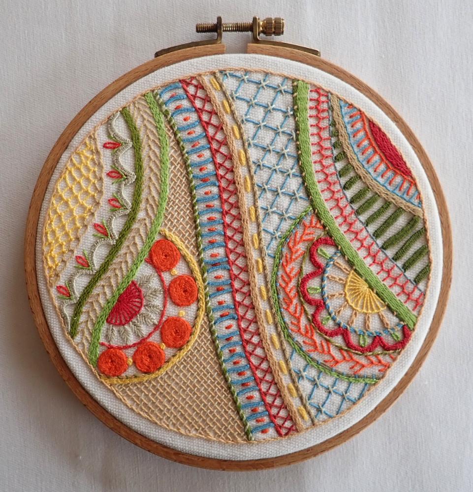 I’m a little behind because I was on vacation. I love seeing everyone’s colors and stitches. I’m hoping to catch up this weekend and post some new pictures. While on vacation I decided to start another one and do what Deborah suggested and do one stitch in many variations. I decided to do the lines in chain stitch with all kinds of variations.…[Read more]