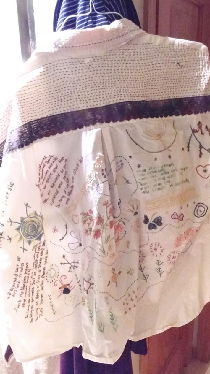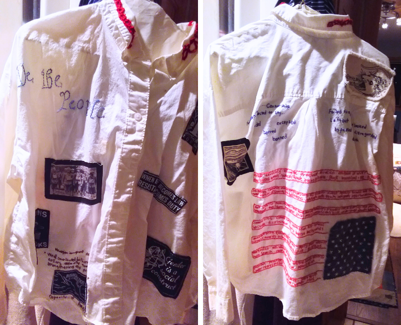 I stitched a Protest Shirt by drawing an American flag upside down and for the red stripes used red thread and stitched banned words and phrases from government publications. I included a photo. What’s going on in the world inspires art, and making it made me feel empowered.