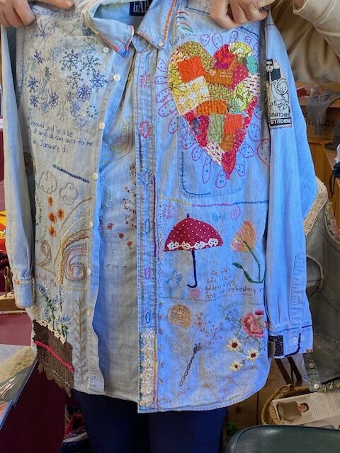 I proposed a daily stitch project with a friend that started last January. We each chose a denim shirt and at the end of the month, we revealed our work to each other. Both our shirts are very different, as our imagination takes on a theme each month. Some months are obviously themed to correspond with the time, but some are more random. My friend has combined months sometimes with one idea. My shirt will be totally covered front and back with just a little on the sleeves. We’re already planning a similar project for next year as it’s been so meaningful and fun.