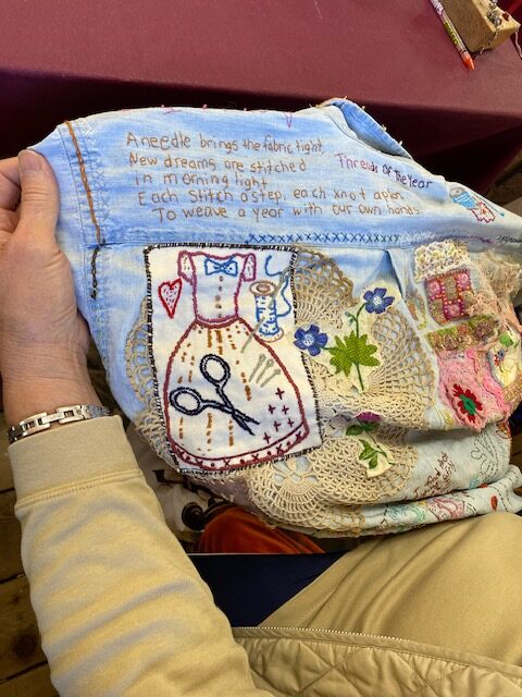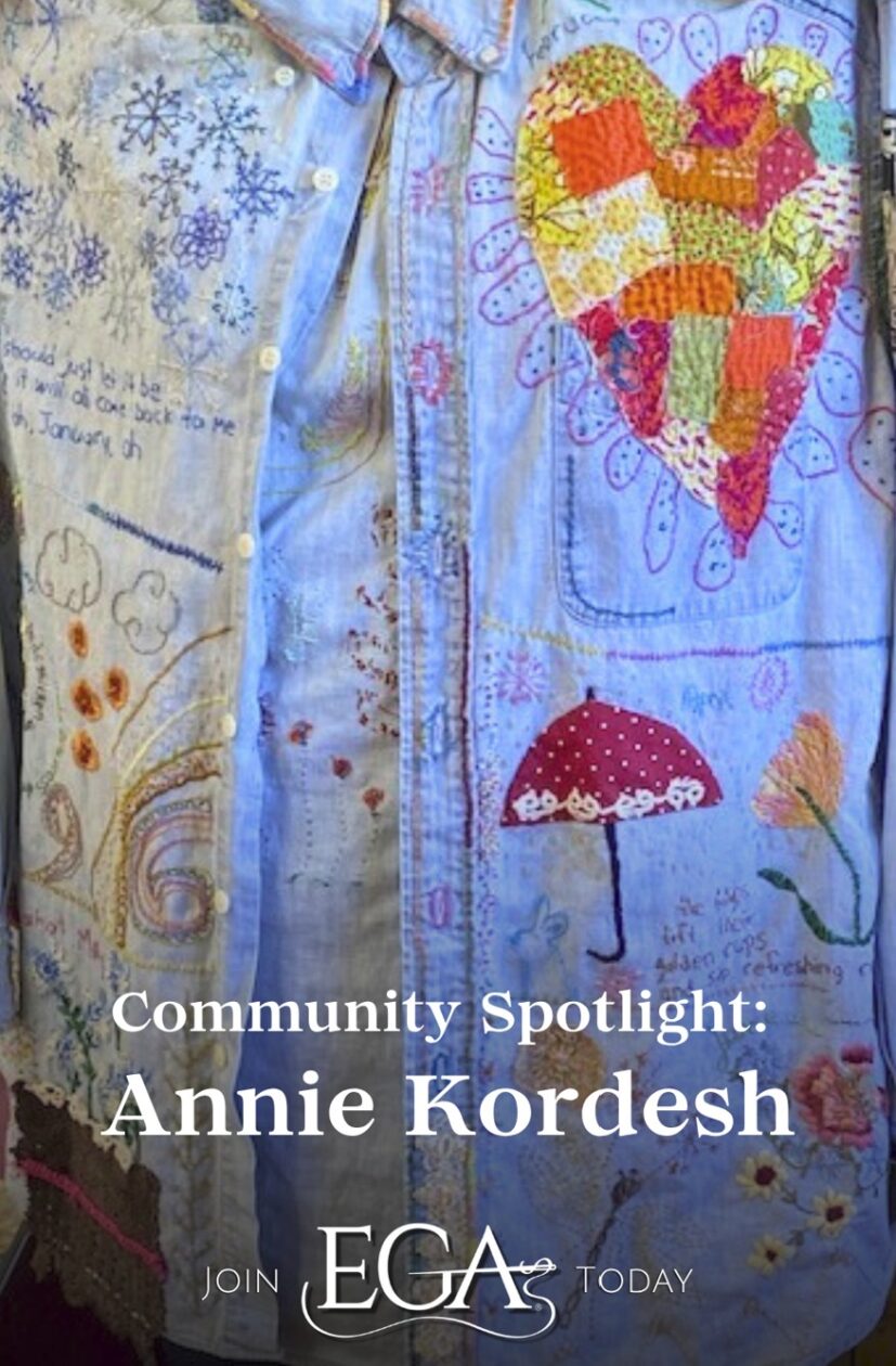Earlier this season, Wendy Lynn, one of the hosts of EGA’s Counted Thread Special Interest Group and Surface Embroidery Specialty Group, visited a knit studio and met creative textile artist Annie Kordesh. Annie happened to be stitching on a shirt she called her “Threads of the Year” shirt, to which Wendy was immediately drawn. Annie’s simple, classic denim shirt was covered in a careful selection of stitches, motifs, and fabrics, using several different techniques. Wendy was simply blown away, and knew it was something the EGA community needed to see. Annie, who works as shop manager and registrar for Fine Line Creative Arts Center in St. Charles, IL, graciously agreed to invite us into her process. We hope these glimpses into her work inspire EGA’s stitchers as we start the new year!