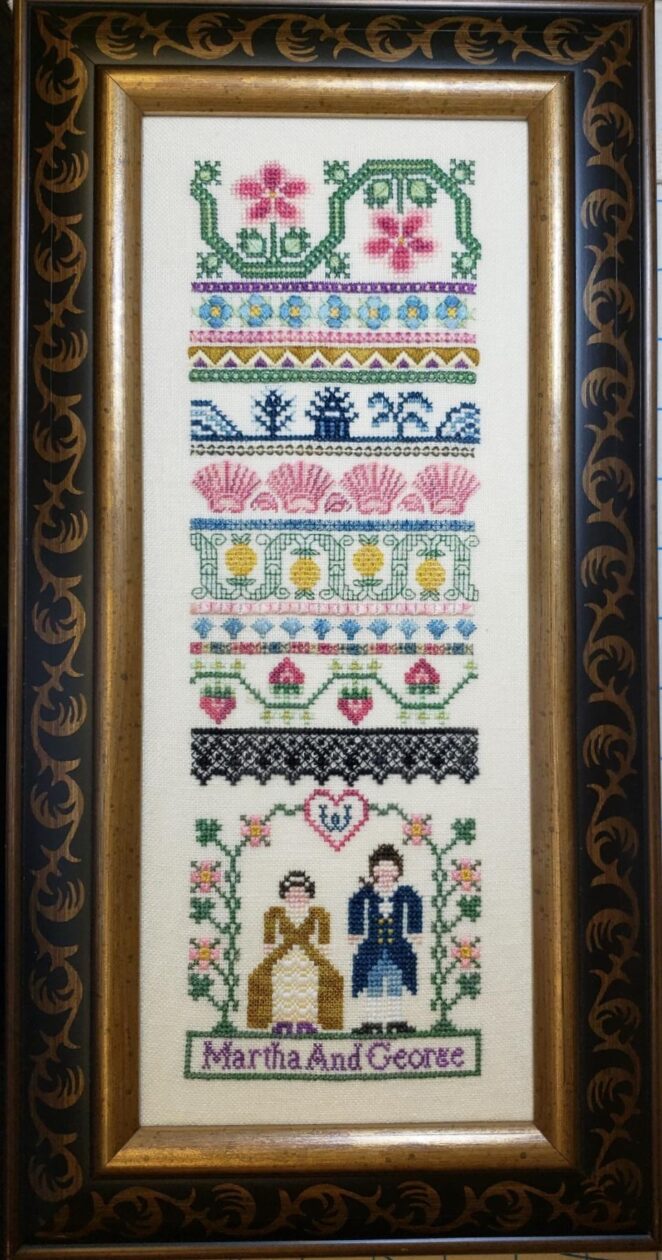 I was originally thinking about making a sampler for Betsy Ross, but I stumbled on a book about Martha Washington, and that moved me to start creating a new class design. As I read the book, I started to visualize the stories each band of the sampler would represent along with stitches for these bands. I love history and wanted to share Martha’s life with other stitchers, especially since she was also an avid stitcher!