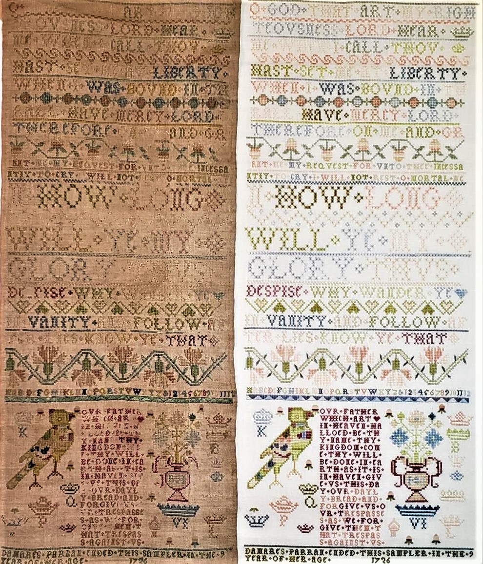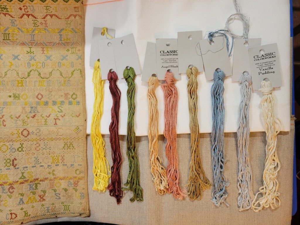 If possible, I try to use a similar color and thread count of linen. If the sampler is not framed, I study the unfaded colors on the back to recreate the sampler as it was originally stitched. I spend a lot of time, using my strongest magnifiers, to reproduce the exact stitches used on the sampler.