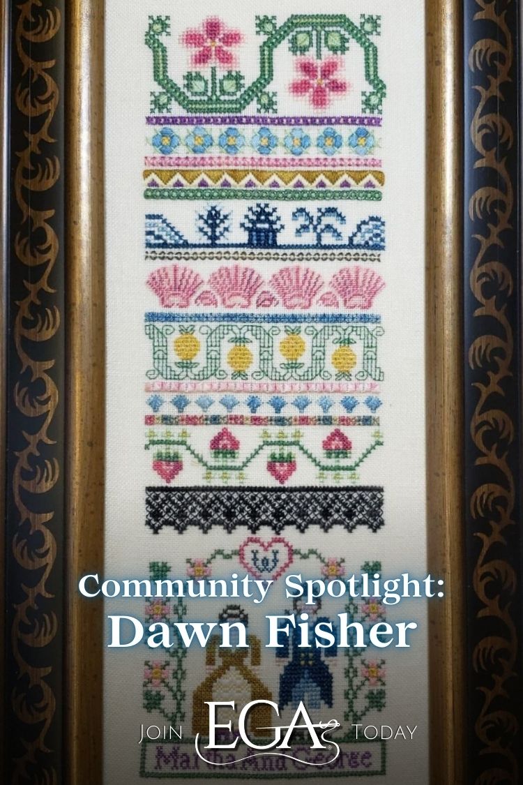 Class registrations for EGA National Seminar 2026: Wish Upon a Stitch are now open! There are so many wonderful needlework teachers, techniques, and classes to explore this fall. We talked with Dawn Fisher, who is teaching Class 2106 Lady Washington (shown above), a sampler showcasing bands that represent the life of Martha Dandridge Custis Washington. The sampler begins with the Martha Washington Geranium and concludes with Martha and George in their wedding finery. In addition to learning numerous stitches, students will learn Martha’s captivating life story including her upbringing, first marriage, the births and deaths of her children, her life with George especially during the Revolutionary War, her life as the first “First Lady” and her life after the death of her beloved husband, George. Stitchers can trust in the veracity of the motifs and themes represented in Lady Washington—reproduction and historical samplers are Dawn’s passion, and she takes very seriously the art of accurate reproduction. Keep reading to learn more about the many steps Dawn takes to create faithful reproduction samplers.