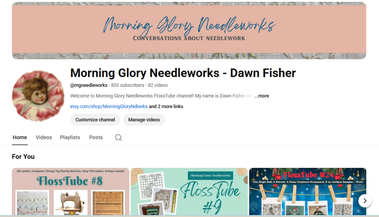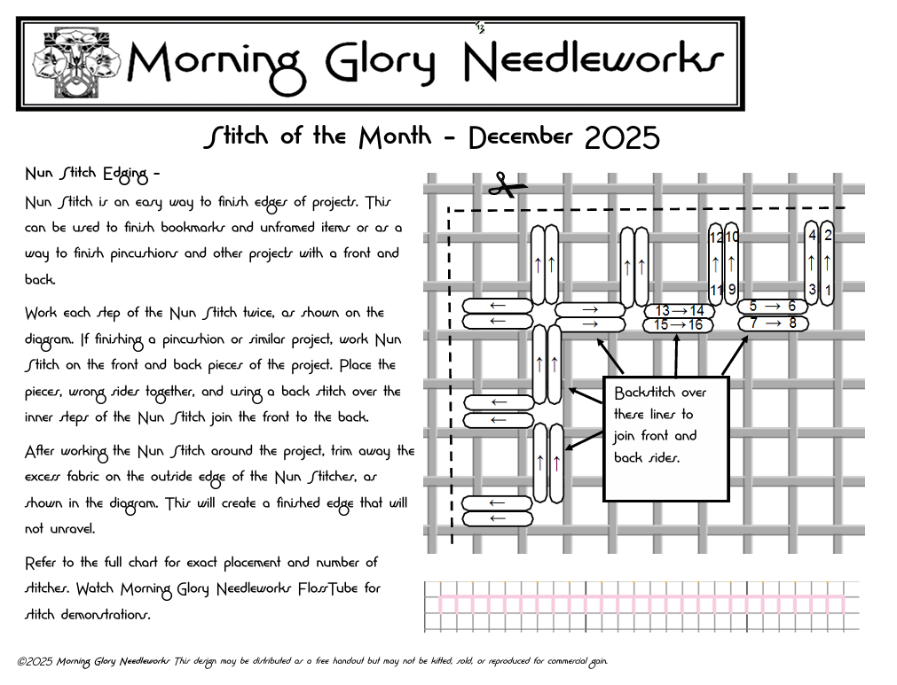 For several years, I posted 2 FlossTube videos each month as Morning Glory Needleworks where I talk about books, needlework, and sewing tools in my collection. The video posted the first of each month and included a new Stitch of the Month, which I discuss and demonstrate. A pdf of the stitch diagram and instructions was then posted in the Stitch of the Month Facebook group. I want to share my love of stitching and stitches with everyone!