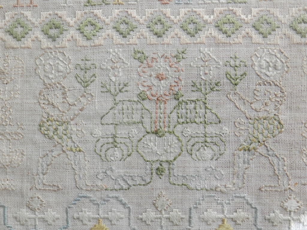 Because of this, it was very challenging to reproduce Sary using typical charting methods. I am happy to say, I have reproduced the sampler and stitched the reproduction but have not released the pattern yet. I am hoping to release the chart soon.