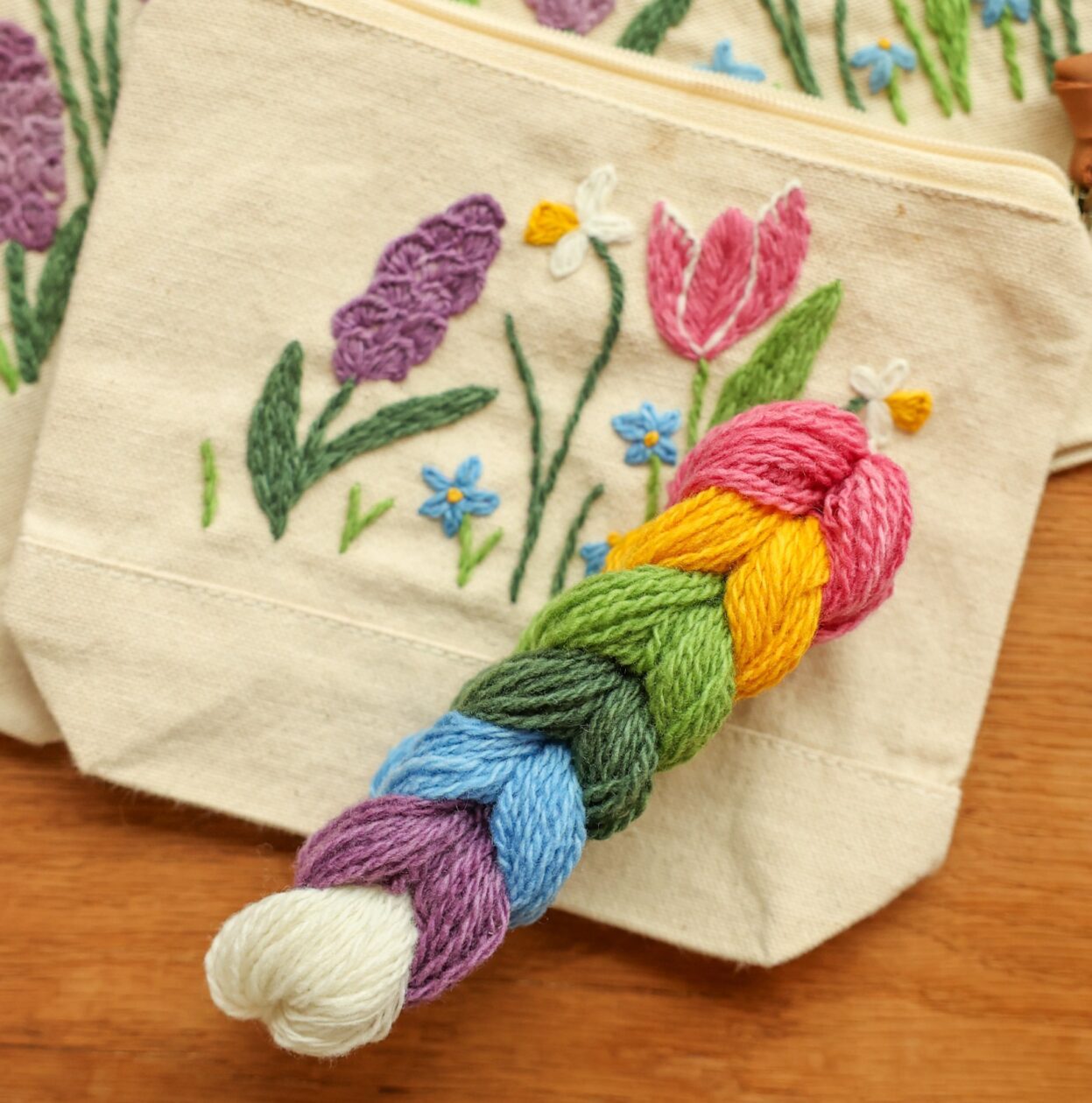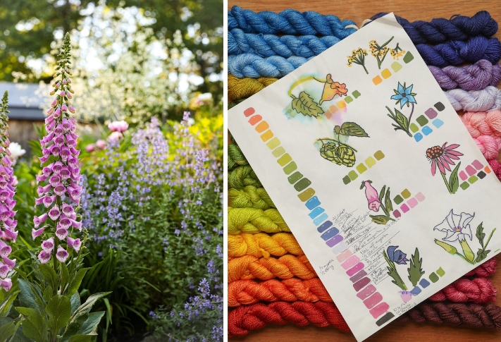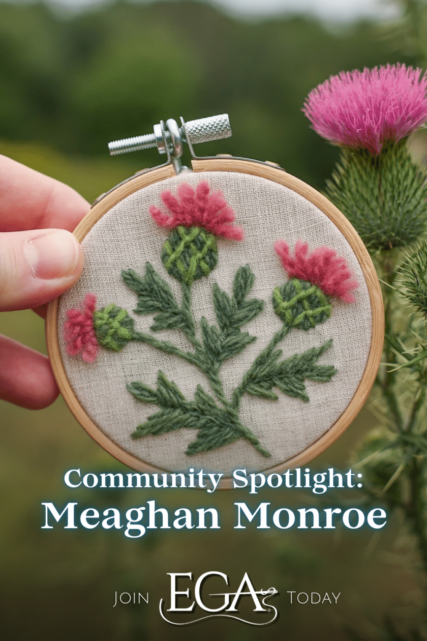 Meaghan Monroe and her family are the passionate design and dye team behind Subito Farm, which offers hand-dyed yarns, fibers, knitting and embroidery patterns, and kits for hand embroiderers and knitters. Meaghan has created two gorgeous patterns for the EGA community—the delightful Autumn Flowers Boots Embroidery for Outside the Hoop, and the new Spring Flowers Zipper Pouch. We wanted to learn more about how Meaghan translates her love of florals into embroidery designs and how she and her family capture the colors of nature in their hand-dyed yarn and embroidery threads.