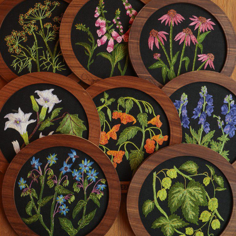 I am currently finishing up a new series of eight silk shaded embroidery kits that will be available for the first time in April. I had the idea about a year ago to make these kits because I love the process of silk shading and I think it looks incredible on black fabric. I really leaned into the botanical drawing/apothecary inspiration and chose plants with antiquated medicinal uses. These are my largest designs so far, each fits inside an 8-inch embroidery hoop. I am very proud of how they turned out and I hope everyone who sees them will be inspired too.