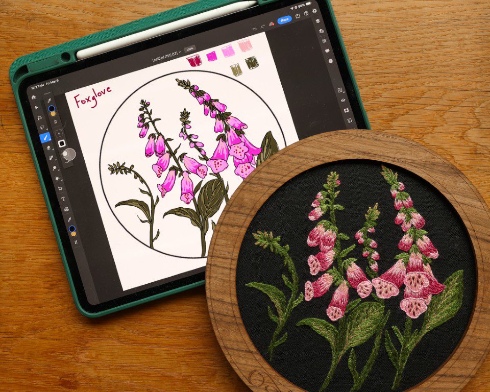 Once I have an idea of what I want to stitch, the first step is sketching the design. I like to draw out a design on my tablet before I stitch it to help with placement of different elements. Sometimes I will also add color to my drawing, especially if I am going to be dyeing new colors for a design.