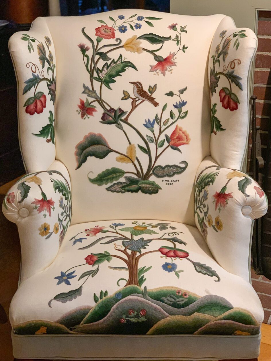 I suppose my first experience with needlework and embroidery was seeing all of the beautiful work my grandmother created and continues to create. She is a prolific stitcher, everyone in my family has at least one hand stitched quilt from her, all of the grandchildren have cross stitched samplers marking our births, and she has even stitched the upholstery for multiple wing back chairs with crewel embroidery (see below).
