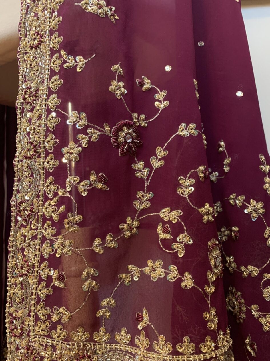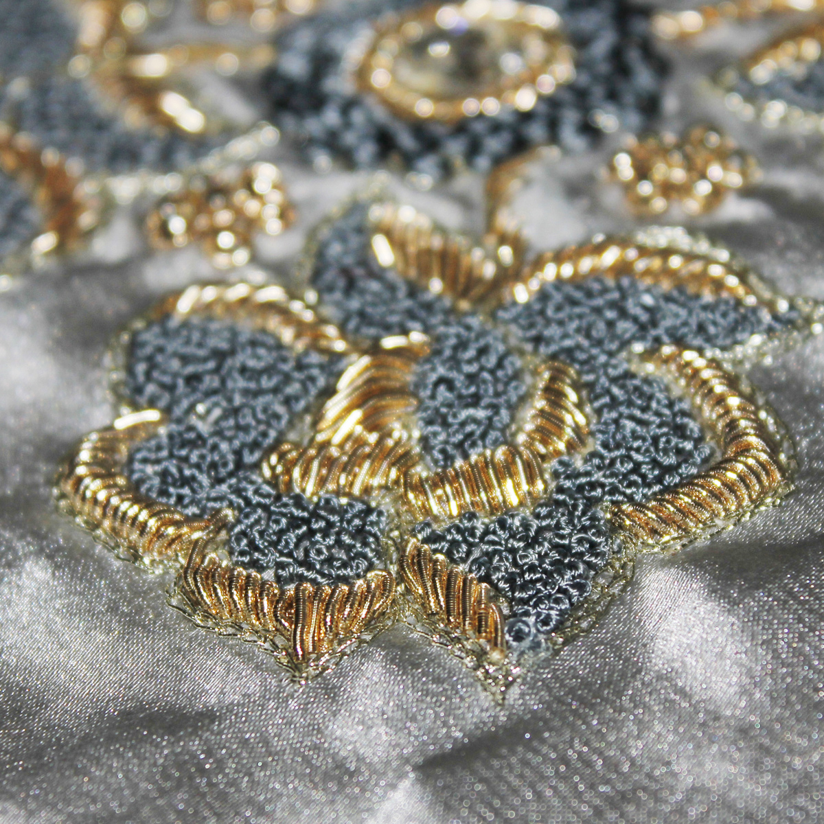 The word “zardozi” translates to “gold embroidery”—zar or zari meaning gold, and dozi meaning sewing, in Persian. Zardozi made its way to the Indian subcontinent in the 17th century. The style and technical practice of modern day Zardozi rose to prominence during this period due to the influence and support of the Mughal empire.