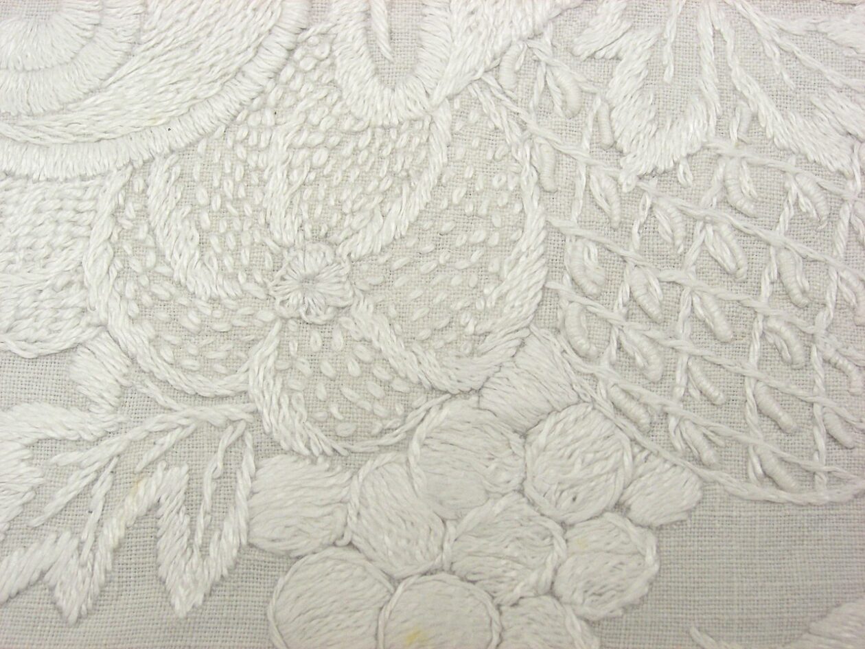 Materials, Techniques, and Stitches: Mountmellick embroidery is stitched with thick white cotton thread on heavy white cotton satin jean; both materials contributed to the durability of items embellished with Mountmellick embroidery. Despite being all white and used primarily for household linens, stained Mountmellick items could be boiled and cleaned easily without the items falling into disrepair. Although Mountmellick embroidery is sometimes referred to as Mountmellick lace, the style does not feature drawn or pulled thread or eyelets. It is a densely textured, raised style of embroidery that showcases knotted and padded stitches.