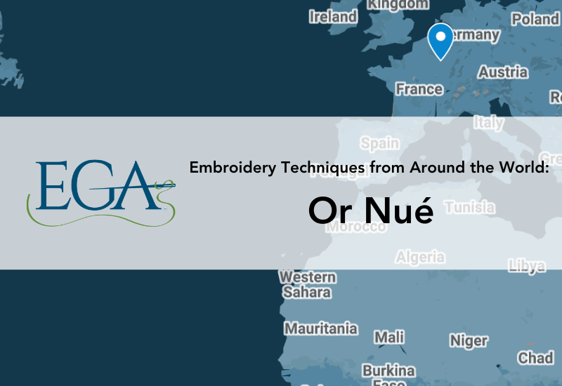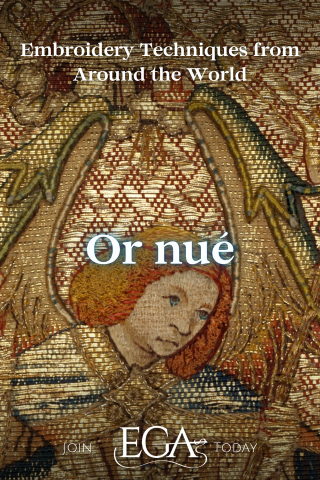 Learn more about Or nué and medieval goldwork embroidery in the Virtual Lecture, Embroidered Treasures from the Middle Ages at Agnani Cathedral, Italy with Dr. Jessica Grimm (Recording only available through January 12, 2026), in our Community Spotlight on Dr. Jessica Grimm, and by exploring Dr. Jessica Grimm’s website, Acupictrix. EGA also offers a Master Craftsman program for Silk & Metal Threads in which embroiderers can demonstrate their mastery in goldwork techniques.