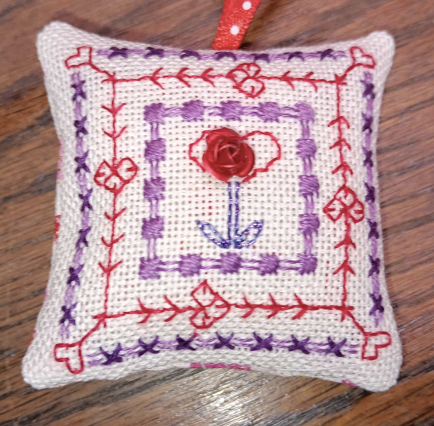 “Take a tiny piece of evenweave, small amounts of pink and purple thread, a marvelous rose bead/button/embellishment, and create this tiny scissor fob or pincushion for your favorite person or keep it for yourself!”