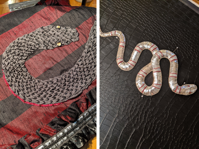 I am also very fond of the little bead-embroidered creature I made for the stomacher of my Laudna costume. Her character’s magical familiar is a little undead rat with a crow skull for a head, so I embroidered him with rhinestones for his bones.