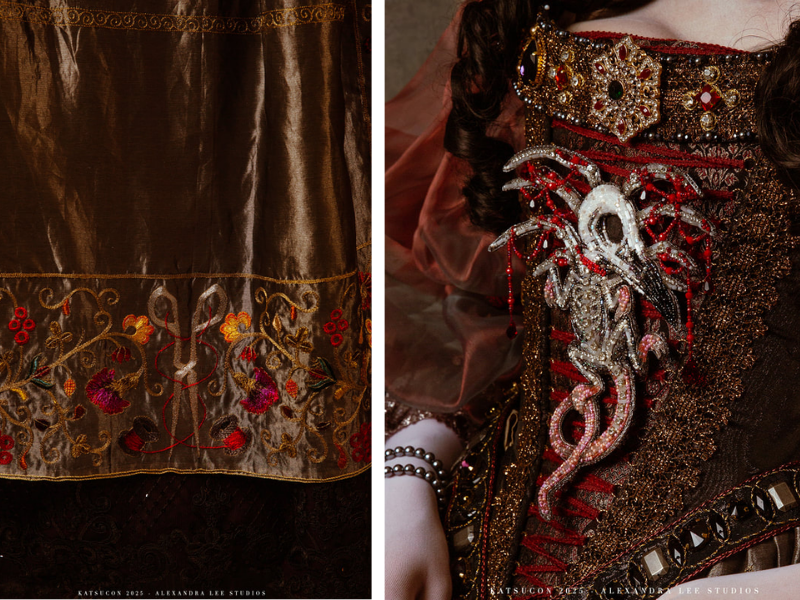 I had always liked dressing up for Halloween, and when I discovered fandom culture in the late 1990s and that you could dress up any time of the year, that changed the trajectory of my life. The more costumes I made, the more I found I enjoyed fine detail and hand work, so over time I have tended to choose designs where I can integrate needlework since I enjoy the process so much.