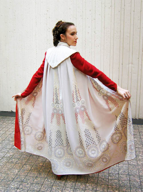 When judging needlework I look for neatness and cleanliness of execution, creativity of material use, and appropriateness for the design. For example, a giant goldwork motif may look impressive, but if it doesn’t fit aesthetically with the rest of the costume, or if it’s so heavy it’s weighing down the cape, that could prove a detriment rather than an advantage. Making educated choices for embellishment techniques is one of the things I teach in the presentations I give at conventions.