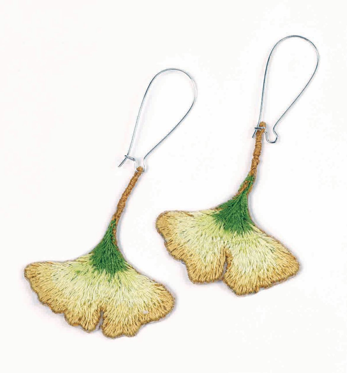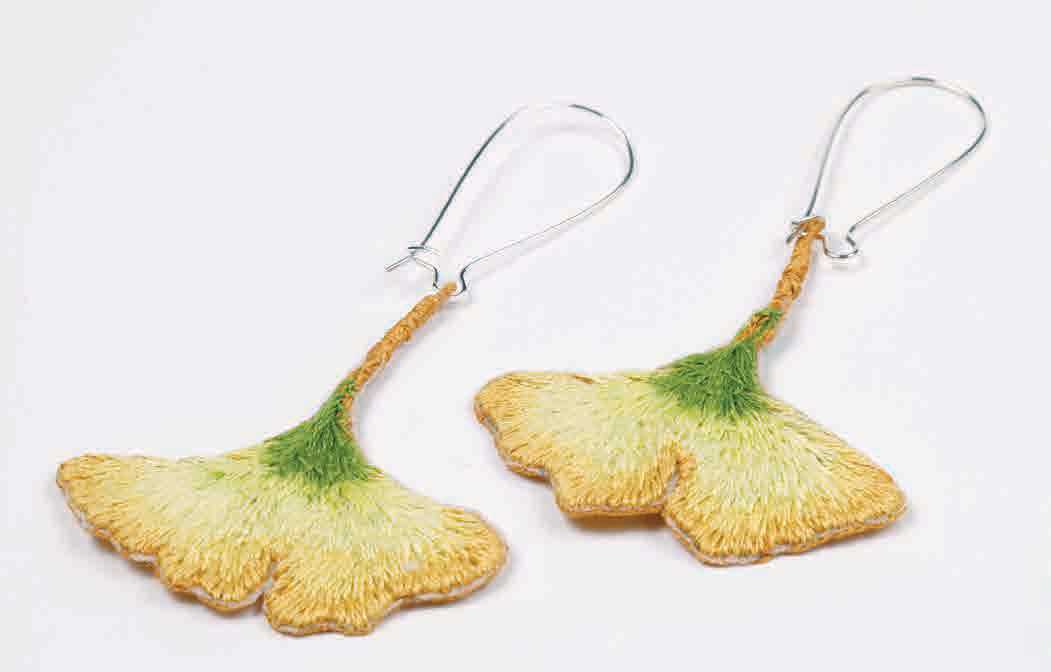 Melissa Galbraith, designer of the popular Textural Terrarium Embroidery in EGA’s Free Projects library, is back with another design for our Outside the Hoop project series. Provided with the permission of Fox Chapel Publishing, Melissa has generously shared the Stumpwork embroidery Gingko Earrings from her new book, 3D Botanical Embroidery and Stumpwork: 17 Thread Projects to Make, Wear, and Display. Learn more about Melissa Galbraith in our Community Spotlight on MCreativeJ.
