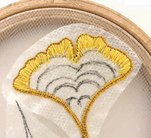 Place two layers of tulle into the hoop. Trace the pattern and press the stabilizer onto the tulle. Use 1 strand of DMC 783 + Loop Start & Couching & Buttonhole Stitch to stitch the outline. Use 1 strand of DMC 3821 + Thread Painting to fill the outermost layer. Slide in between the wire and buttonhole loop.