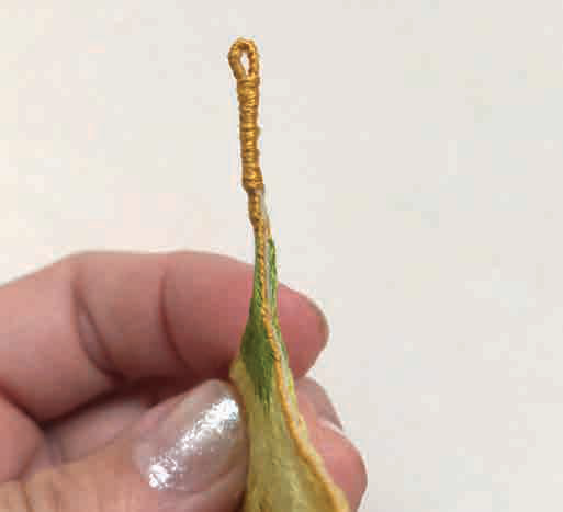 Finish wire. Use 1 strand of DMC 783 + Wire Wrap. Start ½” (1.3cm) away from the base. Once ¼” (6.4mm) of the wire is wrapped, fold the center of that section in half, then continue to wrap the folded wire. Use a glue stick to adhere the thread. Slide the loop onto the earring wire.