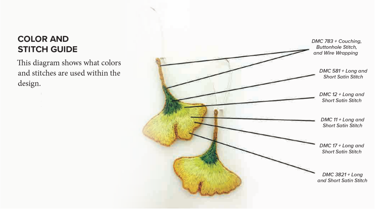 The Gingko Leaf Earrings utilize an embroidery technique known as Thread Painting. For detailed Thread Painting instructions, refer to Melissa’s tutorials here and in the video below.