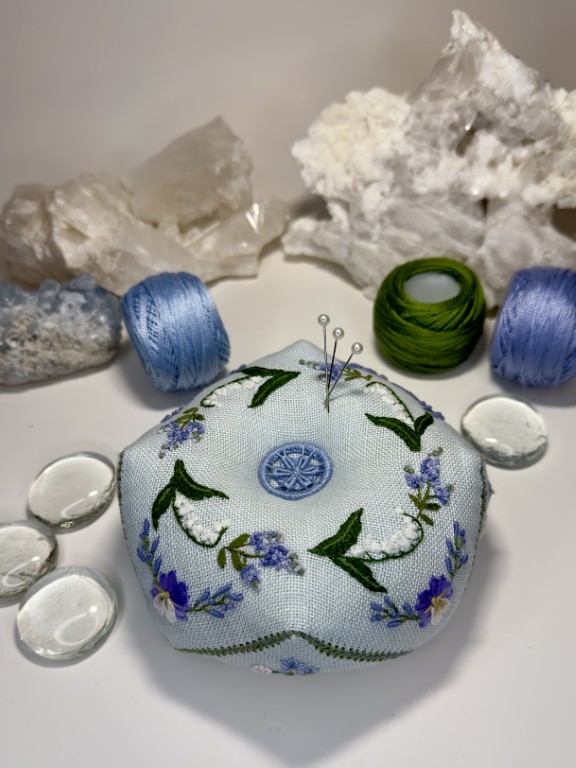 The upcoming Thread Blossoms Virtual Education Course with Pat Olski offers embroiderers the opportunity to stitch the Scissors Safe from her Thread Blossoms set, originally published in issues of Needle Arts Magazine from June 2022 through December 2023. Originally presented as a “Back to Basics” series, the set captivated embroiderers with its intricately detailed floral embroideries and artful design. Pat is a multi-craftual marvel, having published dozens of knit, crochet, and embroidery patterns in magazines and books like Piecework Magazine, Vogue Knitting, Knit Simple, Debbie Bliss, Noro, Inspirations Embroidery, and Needle Arts Magazine. Her love of traditional methods of craft carries over into her design work, infusing historical items like Dorset buttons with a fresh, contemporary beauty. We were delighted to sit down with Pat to discuss her upcoming virtual education course and learn more about her upcoming book, Thread Blossoms: Modern Embroidered Needlework Accessories.