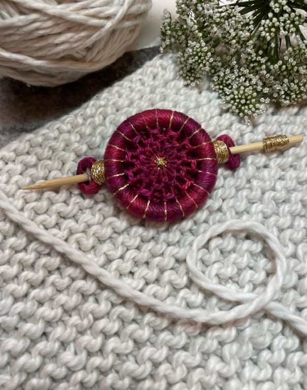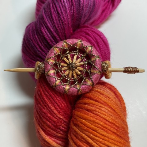 I am generally drawn to blues and greens, and when I was designing shawl pins for my book “Crafting Thread Shawl Pins,” I realized that I needed to add some designs in warmer colors.