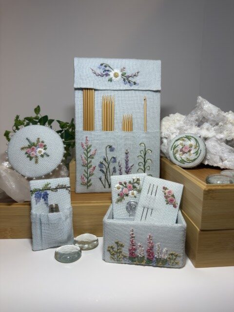 The original designs were each meant to teach a single stitch, and therefore each piece in the set has a different design. I like the fact that the pieces all coordinate so well, even though they all have different patterns. The other five pieces I have added include holders for thimbles, double pointed knitting needles and/or crochet hooks, stitchmarkers, needle threaders, and a small box for supplies.