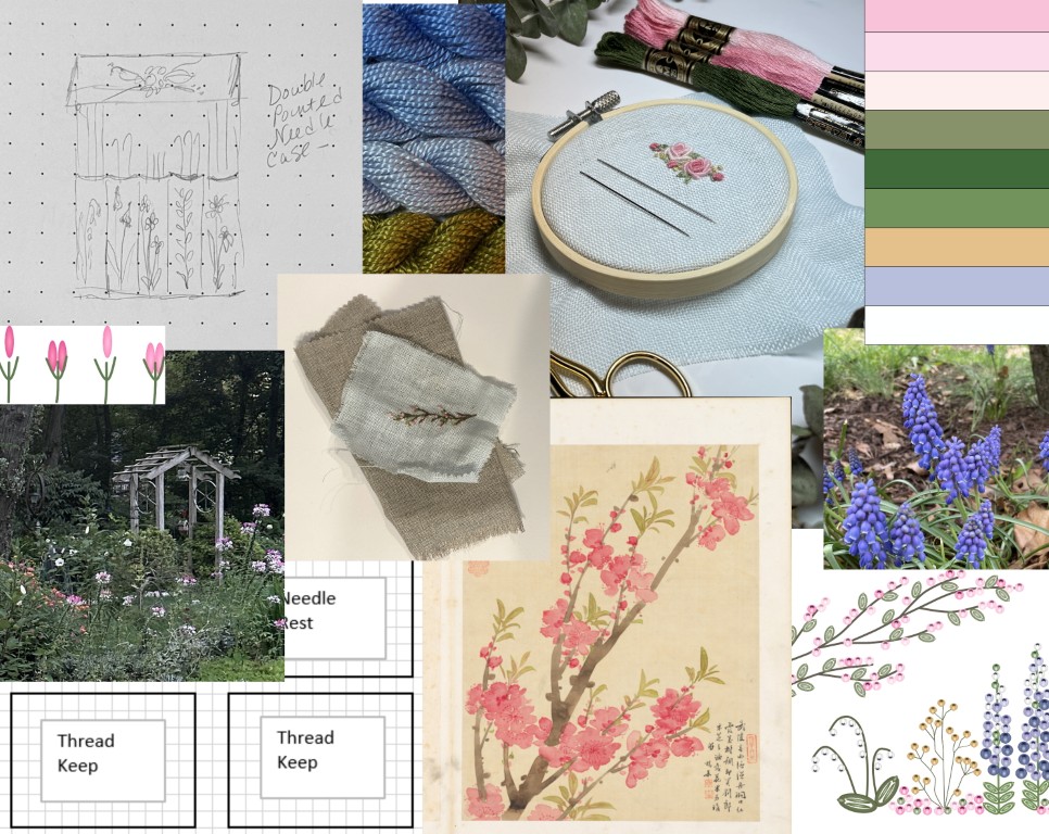 I type all of the details I can into a Word document as I am stitching—it is so easy to forget which color floss or pattern intrigued me the night before, especially if I am stitching a lot. If something is going to be three-dimensional, I will play around with proportions by sketching samples in a graphic design program, or by folding fabric and making mock ups until I am happy with the results.