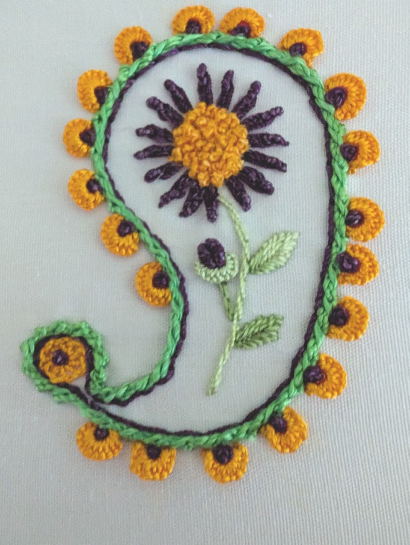 Daisy PaisleyDaisy Paisley is an International Brazilian embroidery project stitched with rayon thread. The Brazilian Dimensional Embroidery Guild (http://www.bdeig.org) defines this embroidery as: “Brazilian Embroidery is hand stitchery done predominantly with dimensional stitches using Z-twisted rayon threads, with the original fine growth/field flowers encouraged.”