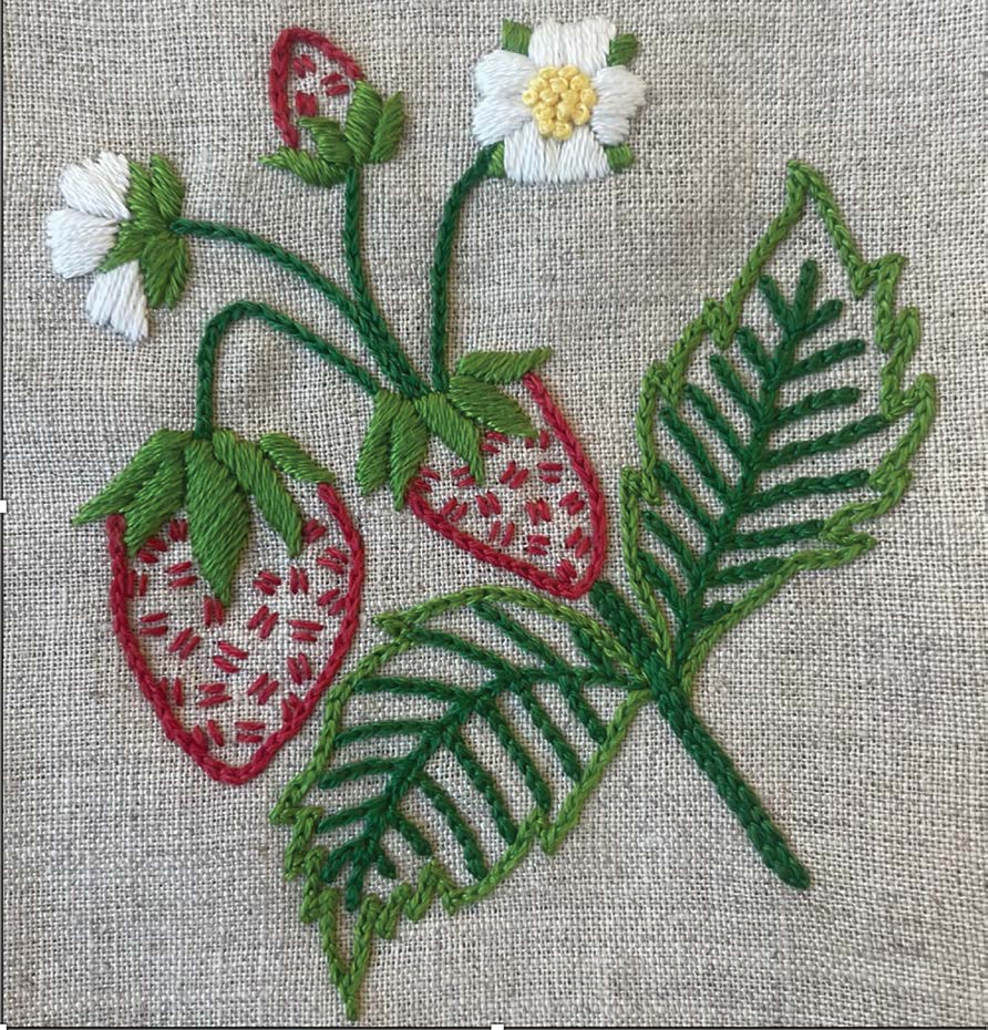 This lovely grouping of strawberry blossoms and fruit is a wonderful example of Lauren Yeager’s focus on nature and realism. Featured stitches include French knots, chain stitch, padded satin stitch, and seeding stitch.
